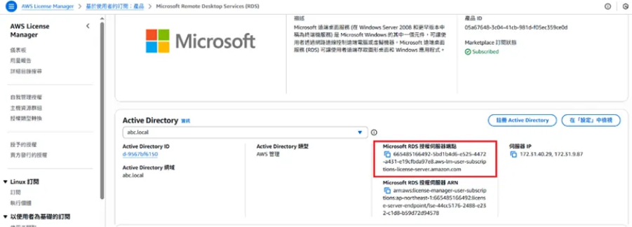 先到 AWS Console 上的 AWS License Manager 左手邊選單的以使用者為基礎的訂閱選擇遠端桌面服務,並按下註冊 Active Directory